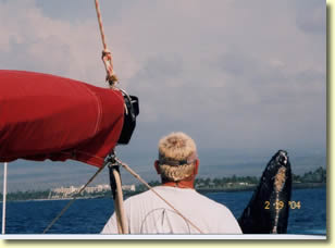| 何度目かのハワイ島で今年は家族もいっしょにホエールウォッチングのヨットに乗り込んで 4〜5mのところで見るクジラはダイナミックで興奮します。 |
